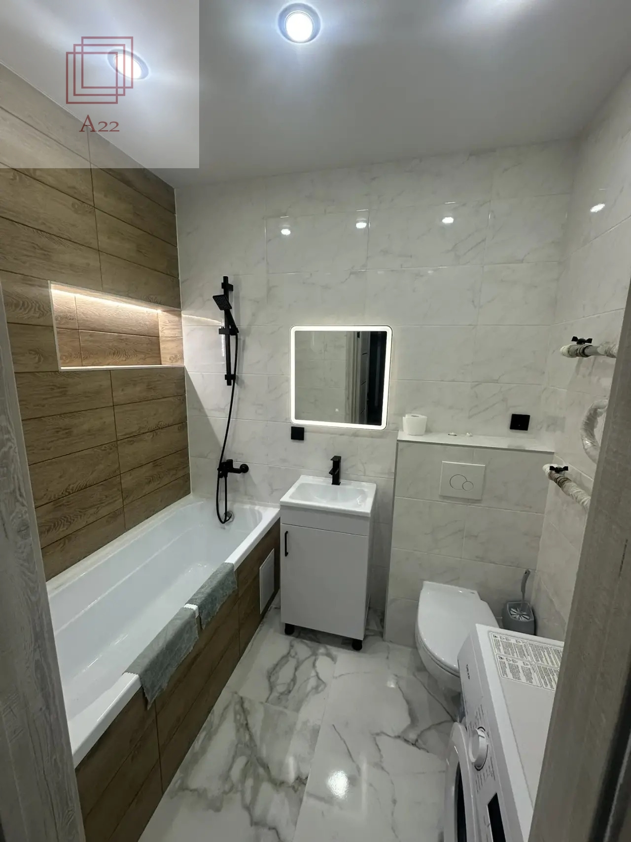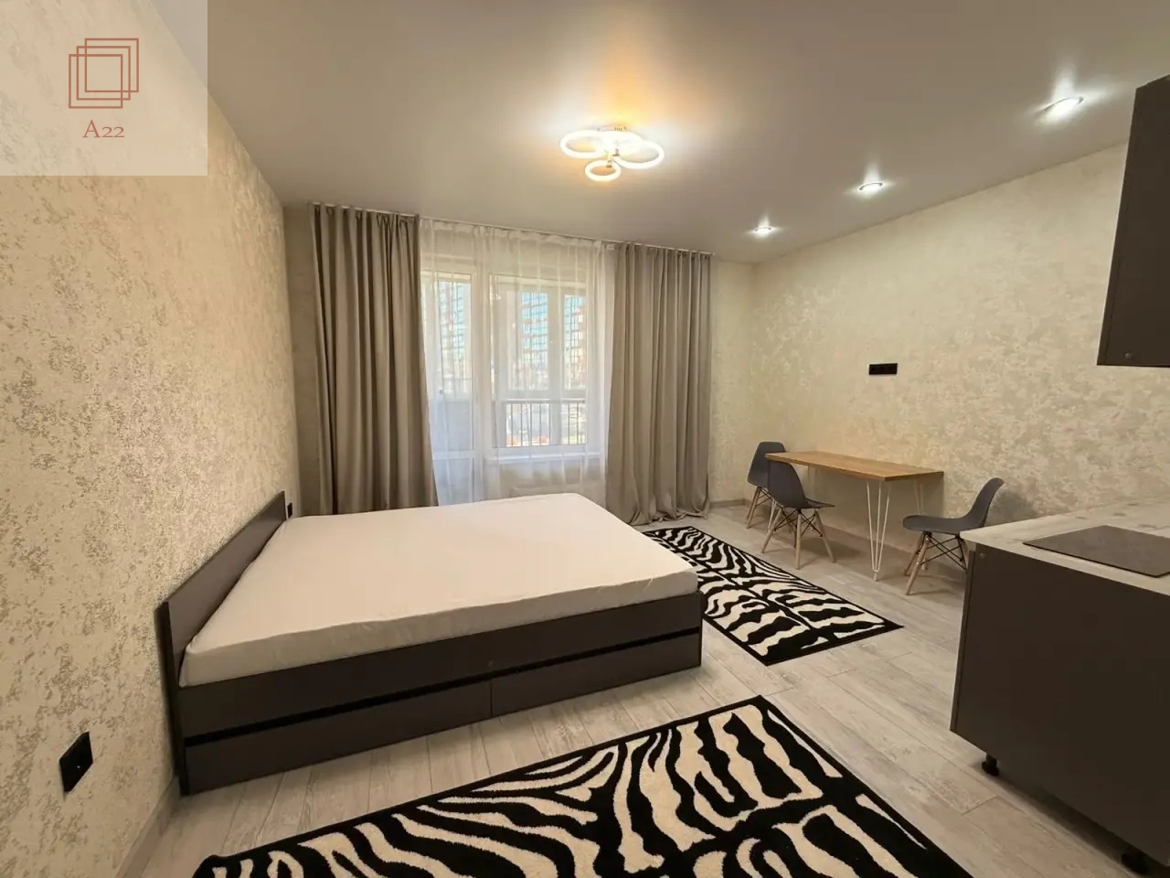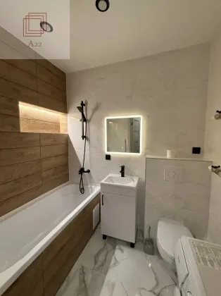 - Качественный ремонт: натяжные потолки, ламинат 33-класса, сантехника премиум-брендов
